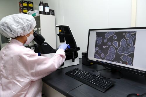 | ▲차바이오텍 연구원이 배양중인 줄기세포를 확인하고 있다 (사진= 차바이오텍 제공) |
