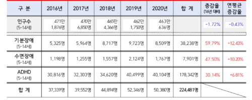 최근 5년간 우울증, 조울증, 수면장애, ADHD 등으로 병원 진료를 받은 어린이가 22만명에 달하는 것으로 나타났다.
