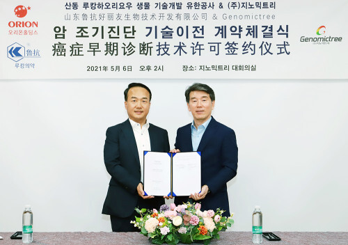 오리온홀딩스는 지난 3월 설립한 중국 내 합자법인 ‘산둥루캉하오리요우생물기술개발유한공사’를 통해 지노믹트리의 대장암 조기진단용 기술 사용에 대한 계약금, 사업진행에 따른 마일스톤, 매출 발생에 따른 로열티 등을 지급하는 데 합의했다.