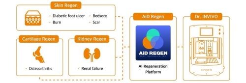‘AiD Regen’은 클라우드 기반의 장기재생 플랫폼이다. 수술실에서 환자의 수술 부위 촬영 후 인공지능으로 환부 위치, 모양을 인식해 3차원 모델을 만들며, 플랫폼에 결합된 4D 바이오 프린터‘Dr. INVIVO 4D’로 재생 패치를 출력해 환부에 이식이 가능하다.