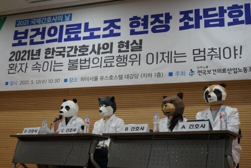 이날 좌담회에는 외과계 PA간호사들과 중환자실 PA간호사들이 신변보호를 위해 동물인형 탈을 쓰고, 음성이 변조된 목소리로 자신들이 직접 경험한 병원에서 일어나는 불법의료 사례에 대해 증언했다.
