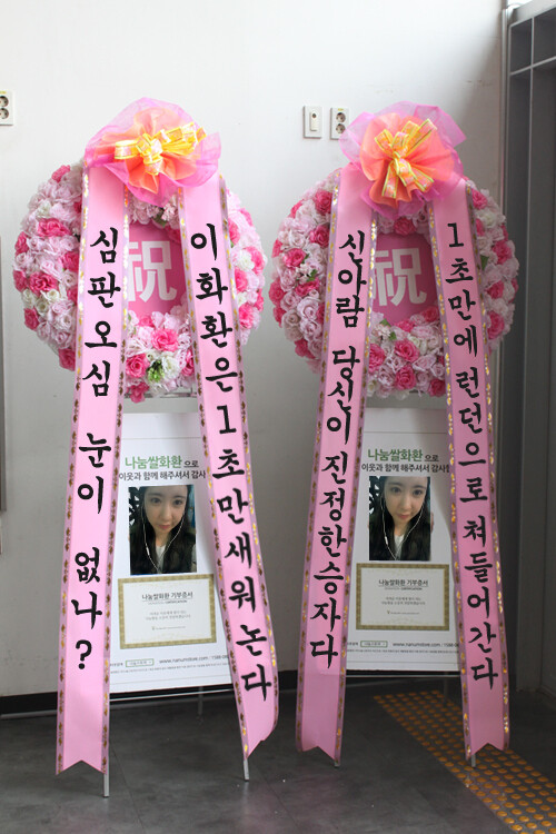 31일 서울 강남 논현동 모처에는 '흐르지 않는 1초'에 패한 신아람 1초 쌀화환이 등장해 눈길을 끌었다.