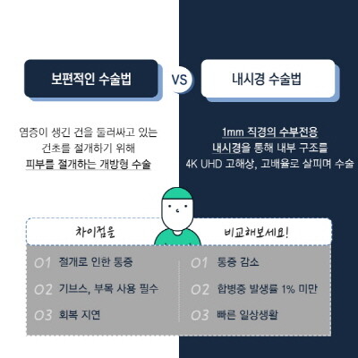 이에 대안으로 떠오른 것이 손톱보다 작은 1mm 초소형 수부전용 내시경이다. 당일 수술/퇴원 원스톱 치료로 진행되어 위 같은 부담을 최소화했다. 내시경 수술은 병변에 1mm 내시경이 들어갈 수 있는 포털을 통해 병변에 직접접근 방식을 택한다. 따라서 절개와 달리 주변조직을 침범하지 않기 때문에 통증 경감뿐만 아니라 회복 속도가 빠르다.