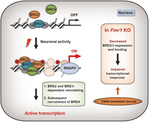 | ▲BET 계열 단백질들의 전사 조절 상에서 작용 원리와 취약 X 증후군에서의 적용 모델 (사진=포스텍 제공) |