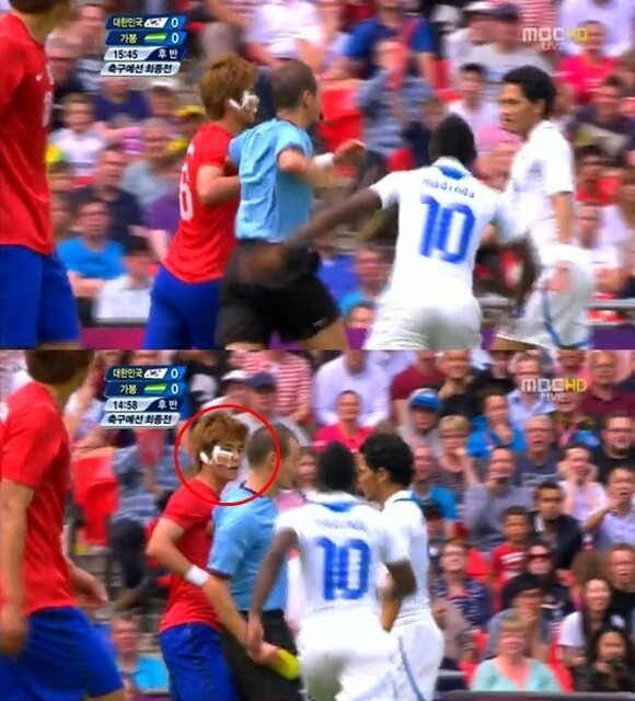 기성용은 후반 15분 가봉의 은둠부와 치열한 몸싸움 중 넘어졌고, 아직 기성용이 완전히 일어나지 않은 상태에서 은둠부의 공 패스가 전해졌다.
