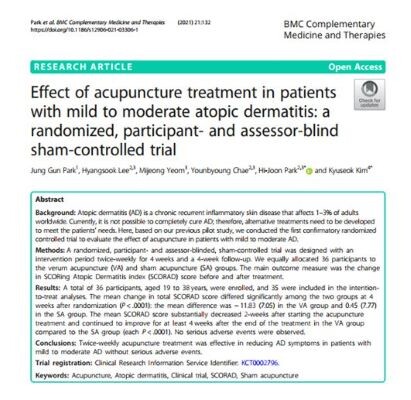 경희대한방병원 한방피부센터 김규석 교수와 경희대학교 침구경락융합연구센터 박히준 교수팀은 ‘아토피피부염 환자를 대상으로 침 치료의 효과를 뒷받침하는 연구 결과’를 보완대체의학분야 SCIE급 국제학술지인 ‘BMC Complementary Medicine and Therapies(IF=2.833)’에 발표했다고 21일 밝혔다.