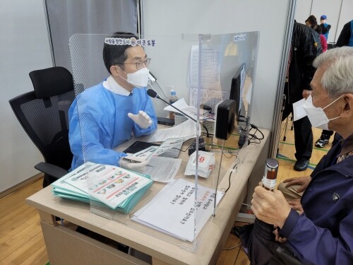 이날 이필수 회장과 박수현 홍보이사 겸 대변인은 약 2시간가량 도봉구 예방접종센터에서 75세 이상 어르신을 대상으로 신체 컨디션 상태, 백신 성분에 대한 알레르기 반응 여부 체크 등 예진 단계의 의료봉사활동을 수행했다.