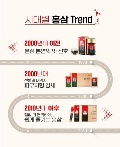 KGC인삼공사가 지난 30여년의 정관장 매출을 분석한 결과, 홍삼 제품에도 시대별 트렌드가 반영돼 세대별 선호 제품이 각기 다른 것으로 나타났다. 2000년대 이전에는 ‘정관장 홍삼정’이 단독 선두를 달렸다면 명절 선물로 홍삼이 떠오르기 시작한 2000년대는 선물하기 좋은 파우치형 제품이, MZ세대가 강력한 소비주체로 부상하고 있는 최근에는 편의성을 내세운 ‘홍삼정 에브리타임’이 인기인 것으로 나타났다.