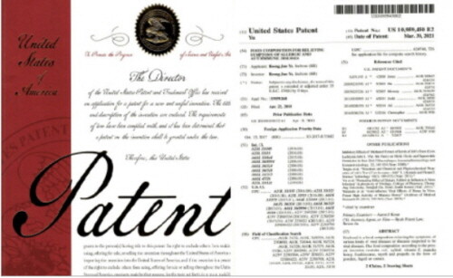 이번 미국 등록 특허는 ‘알레르기 및 자가면역 질환 개선 식품 조성물(FOOD COMPOSITION FOR RELIEVING SYMPTOMS OF ALLERGIC AND AUTOIMMUNE DISEASES, 특허번호 US 10,959,450호)’이다.
