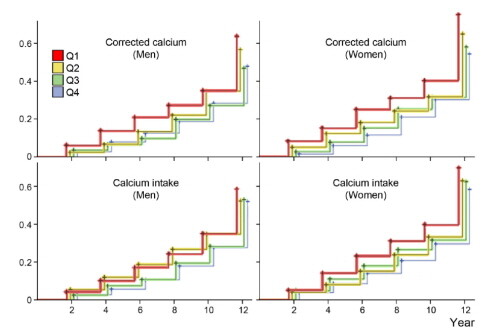 그 결과, 혈중 칼슘농도와 칼슘 섭취량이 가장 낮은 군(Q1)은 가장 높은 군(Q4)보다 근감소증이 남성 1.7배, 여성 2.4배 높은 것을 확인했다.