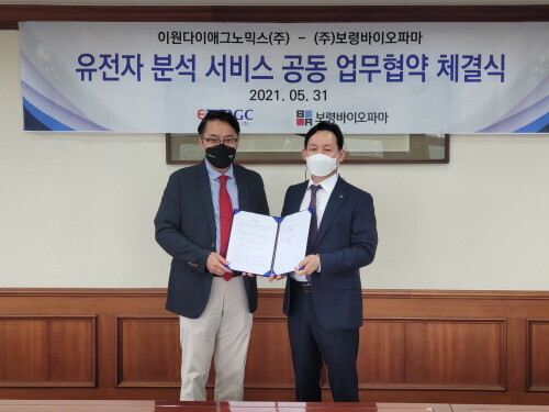| ▲보령바이오파마-EDGC 업무협약 체결식, 좌–EDGC 조성민 본부장, 우–보령바이오파마 장홍두 본부장 (사진=보령바이오파마 제공) |