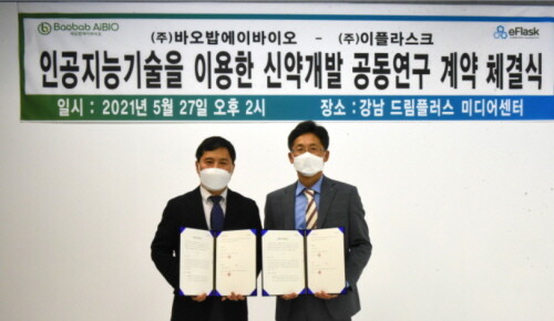 신약연구개발 전문기업인 이플라스크와 인공지능(Al)기반 신약개발전문기업 바오밥에이바이오가 혁신신약개발을 위한 공동연구계약을 지난달 27일 체결했다.