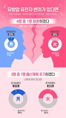 결혼할 의향이 있는 2030세대 4명 중 1명은 상대에게 유방암 유전자 변이가 있을 경우 '파혼'을 생각하고 있는 것으로 나타났다.