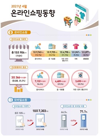 통계청이 3일 발표한 '4월 온라인쇼핑 동향'에 따르면 4월 온라인쇼핑 거래액은 15조 904억원으로 집계됐다. 이는 전년동월대비 25.2% 증가한 규모다.