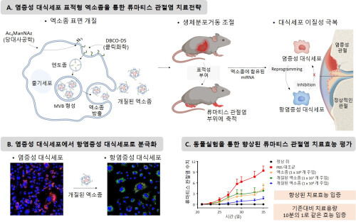 류마티스 관절염의 염증성 관절 부위를 찾아가 염증성 대식세포를 항염증성으로 바꿔주는 표적형 엑소좀이 소개됐다.