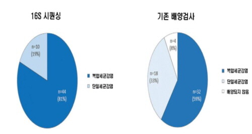 새로운 시퀀싱 기술은 복합세균감염을 더 많이 찾아냈다. 표본 중 약 81%(44/54)를 복합세균감염으로 진단했으나, 기존 배양 검사는 약 51%(32/54)에 그쳤다. 12개의 복합세균감염을 단일세균감염(10개)으로 잘못 파악하거나 균 동정 자체에 실패했다.