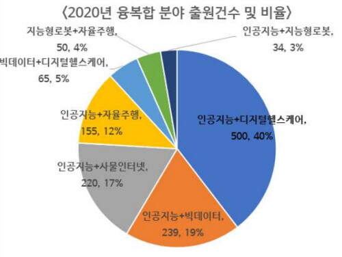 구체적으로 ‘인공지능과 디지털헬스케어’(500건), ‘인공지능과 빅데이터’(239건) 및 ‘인공지능과 사물인터넷’(224건)이 결합된 기술에 대한 출원이 많아 인공지능이 여러 기술과 융합되면서 4차 산업혁명 기반 기술로 자리매김하고 있다는 사실을 수치로도 확인할 수 있다.