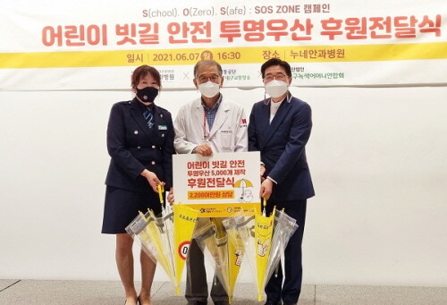 대구 누네안과병원은 지난 7일 TBN 대구교통방송, 대구녹색어머니연합회와 어린이 투명우산 후원전달식을 통해 5000개의 어린이 투명우산을 전달했다.