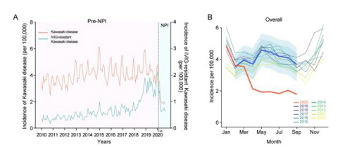 연구결과, NPI 기간 동안 가와사키병 발생률은 이전과 비교했을 때 약 60% 수준으로 감소했다. 코로나19 발생 이전 가와사키병은 10만 명당 31.5건이 발생했지만, 코로나19 대유행기간 동안 10만 명당 18.8건이 보고됐다.