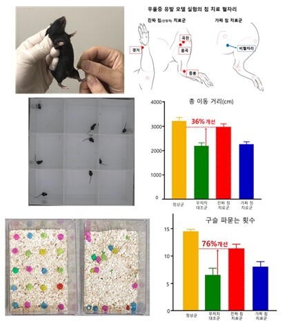 관찰 결과, 우울증을 유발한 실험쥐에게서는 움직임이 줄어드는 우울증 대표 행동증상이 나타났는데, 진짜 침 치료군은 개방장 실험(Open field test)에서의 총 이동거리가 약 36% 증가했고, 구슬 파묻기 실험(Marble burying test)에서의 행동반응도 약 76% 증가했다.