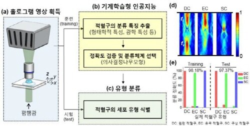 | ▲홀로그래픽 현미경과 기계학습형 인공지능 알고리즘을 이용한 적혈구 분류체계 (그림=한국연구재단 제공) |