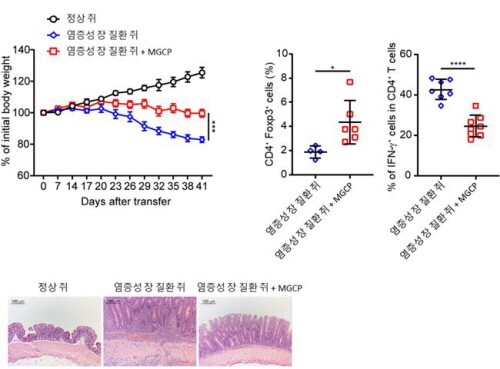 | ▲MGCP를 투여한 생쥐는 체중 감소가 억제되고 대장의 염증 반응 역시 완화되었다. 또한 MGCP를 투여하면 대장에서 염증 반응을 매개하는 IFN-γ를 생성하는 Th1세포가 감소하고 염증 반응을 억제하는 Treg세포를 증가하도록 유도하여 염증성 장 질환을 억제하는 것을 확인했다. (사진=POSTECH 제공) |