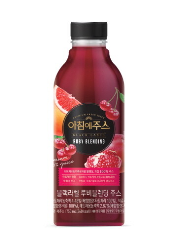 이번 신제품 ‘아침에주스 블랙라벨 루비 블렌딩’은 과일계의 ‘루비’로 불리는 타트체리와 석류, 자몽을 블렌딩한 과즙 100% 프리미엄 주스다.