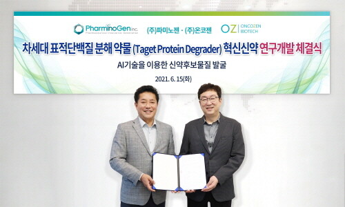 항암 바이오벤처 온코젠과 인공지능(AI) 신약개발 전문기업의 파미노젠은 양사의 핵심 기술을 활용한 차세대 글로벌 항암제 개발을 위한 표적단백질 분해 약물(Target Protein Degrader) 혁신신약 연구계약을 체결했다고 15일 밝혔다.