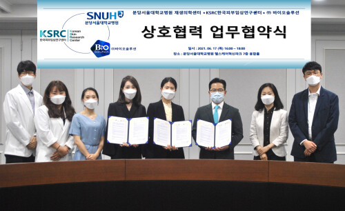 | ▲바이오솔루션은 분당서울대병원 재생의학센터, 한국피부임상연구센터와 의료기기 등의 임상시험 활성화를 위한 삼자간 협약을 체결했다 (사진=바이오솔루션 제공) |