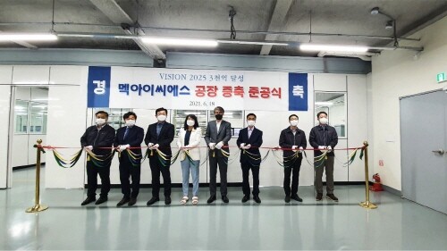 | ▲멕아이씨에스 김종철 대표이사(우측에서 4번째)와 임직원들이 공장 증축 준공식을 진행하고 있다. (사진=멕아이씨에스 제공) |