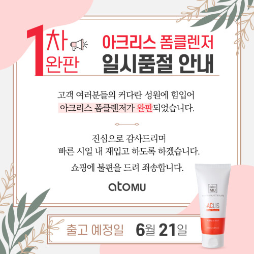 스킨케어브랜드 아토뮤는 신제품 ‘아토뮤 아크리스 폼과 세럼 세트’가 조기 품절돼 현재 해당 제품을 일시 품절, 예약 구매로 전환했다고 18일 밝혔다.