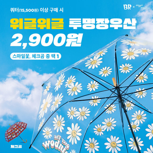 ‘위글위글 투명 장우산’은 다가오는 장마철 필수품인 장우산에 두가지 패턴의 디자인을 적용했다. 각각 활짝 웃는 데이지꽃 일러스트 ‘스마일 위 러브’와 브라운 체크와 배스킨라빈스 아이스크림을 즐기는 곰돌이 캐릭터를 그려 넣었다. 성인 혼자 넉넉히 사용하기 좋은 사이즈의 장우산으로 심미성과 실용성을 모두 갖췄다.
