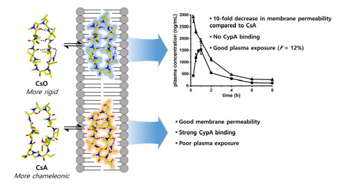 연구팀이 발굴한 고리형 펩타이드는 사이클로스포린 A의 구조적 유사체인 사이클로스포린 O이며, 두 물질의 비교 연구를 통해 분자량 1000 달톤(Da) 이상의 고리형 펩타이드가 경구투여 약물로 개발되기 위한 구조적 조건을 규명했다.