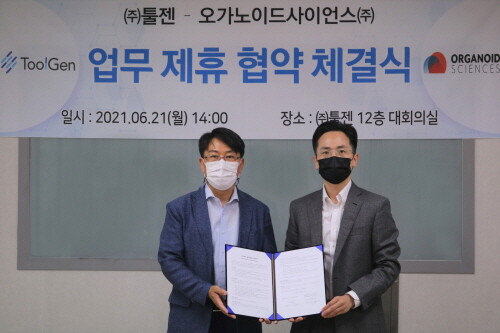 | ▲ 툴젠 김영호 대표이사(왼쪽)과 오가노이드사이언스 유종만 대표이사(오른쪽)가 업무협약을 체결하고 있다. (사진=툴젠 제공) |