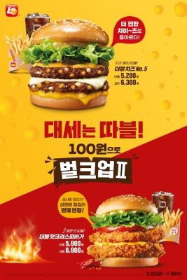 롯데GRS 관계자는 “지난 +100원 벌크업 시즌1 운영으로 가성•가심비 소비에 대한 고객 니즈를 반영하고, 장기 프로모션의 혜택을 고객에게 제공하고자 치즈No.5 버거를 더블 패티로 높여 벌크업 시즌 2를 기획했다”고 전했다.