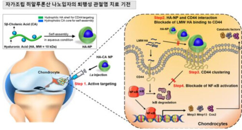 CD44 수용체에 작용하는 퇴행성 관절염 치료제 후보물질로 자가조립 히알루론산 나노입자의 가능성을 제안한 이번 연구가 기존 선형 히알루론상의 낮은 생체 내 안정성과 분해산물로 인해 유발될 수 있는 염증반응 등을 극복할 실마리가 될 것으로 기대된다.
