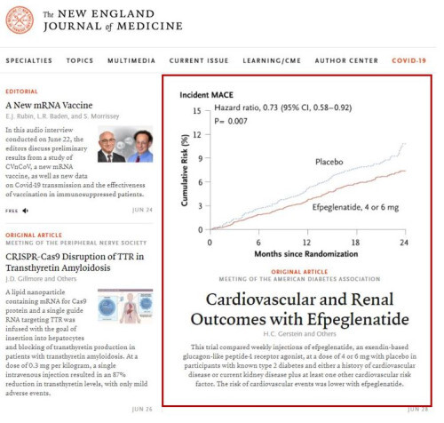 한편, 이번 발표 직후 권위있는 국제 학술지인 뉴 잉글랜드 저널 오브 메디슨(New England Journal of Medicine, NEJM)은 에페글레나타이드 관련 논문을 게재했다.
