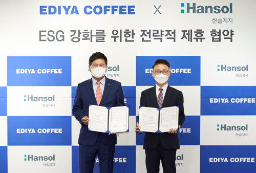 | ▲이디야커피는 한솔제지와 친환경 사회 실현을 위한 업무협약식을 진행했다 (사진=이디야커피 제공) |
