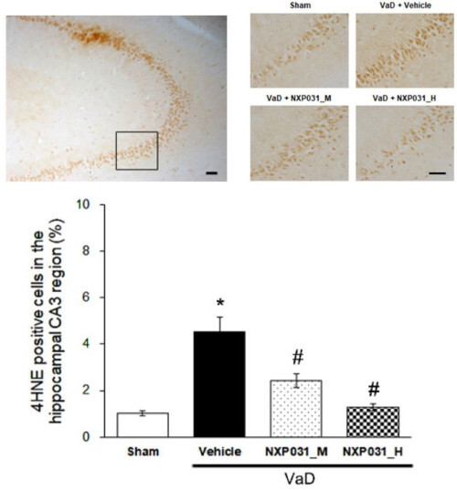 본 실험은 만성 대뇌 저관류로 유발한 혈관성 치매 쥐 모델에서 ‘NXP031’ 투여한 그룹이 Nrf2-ARE 경로를 활성화하여 항산화효소인 SOD-1 및 GSTO1/2의 발현 증가시켜 세포내 항산화 방어기전을 증가시켰고, 만성 뇌 관류 장애 후 발생하는 미세아교세포 활성화 및 산화 스트레스를 감소시키는 것을 확인했다.