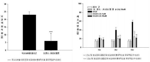 중뇌대동맥 폐색 모델을 이용해 확인한 결과 생리식염수 또는 5% 카르복시메틸셀룰로오스 투여군에서는 뇌경색 용적율이 약 23%로 나타났으나 카리오필렌 10mg/kg 투여에 의한 뇌경색 용적율은 약 7%로, 베타카리오필렌이 뇌세포 보호 효과가 있음을 확인할 수 있었다.