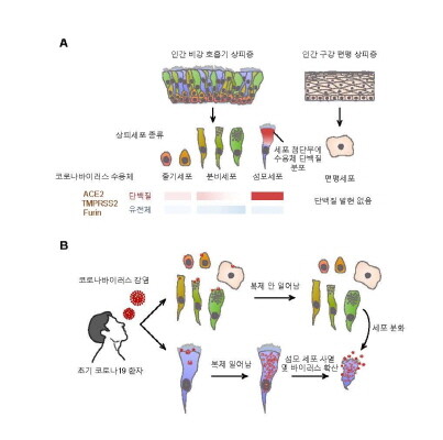 또한 코로나19 초기 환자의 비강 및 구강세포를 분석, 코로나바이러스가 비강 섬모세포에서만 복제·증식함을 최초로 포착했다. 코로나바이러스 수용체 단백질이 없는 비강 분비세포 및 줄기세포, 구강 상피세포 등에서는 감염이 일어나지 않았다.