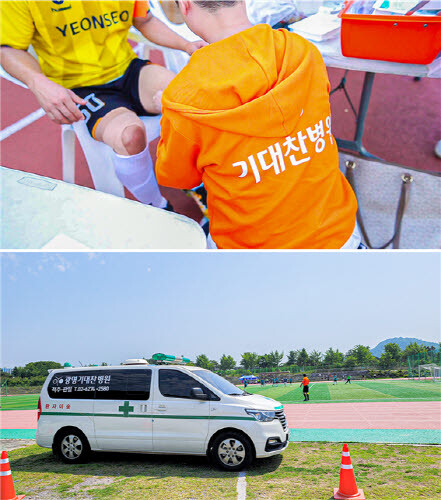 광명기대찬병원은 안전하고 원활한 경기 진행을 위해 의료진이 의료 부스에 배치돼 응급상황을 대비한 인력과 구급차를 파견, 선수들의 상처 부위 소독 및 처치를 했다.