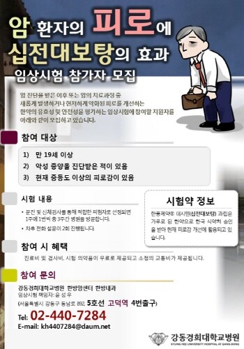 강동경희대학교한방병원 한방암센터 윤성우 교수팀은 암환자의 피로에 대한 십전대보탕의 효과 연구를 위한 임상연구 참여자를 모집한다.