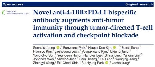 해당 논문은 카이스트(KAIST) 의과학대학원 박수형 교수 연구팀과 공동으로 진행한 연구 성과를 담은 논문으로, ‘Novel anti-4-1BB X PD-L1 bispecific antibody augments anti-tumor immunity through tumor-directed T cell activation and checkpoint blockade’란 제목으로 게재됐다.