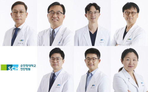 | ▲전섭-백무준-길효욱-최성준-류지원-유익동-정의현 교수 (사진=순천향대천안병원 제공) |