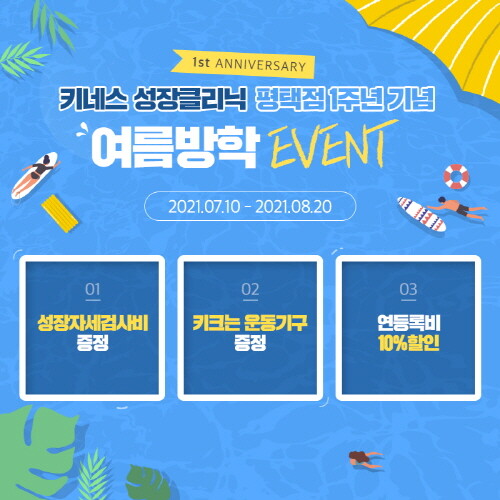 키네스 평택점에서는 1주년을 맞이해 다양한 혜택을 제공한다. 키네스 성장자세 검사비와 키 크는 운동기구 증정과 함께 연등록비 10% 할인 등의 혜택을 만나볼 수 있다.
