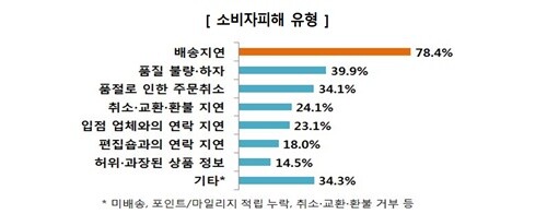 | ▲ 피해 경험 응답자(399명)의 피해유형으로는 ‘배송지연’이 78.4%(313명)로 가장 많았다. (사진=한국소비자원 제공) |