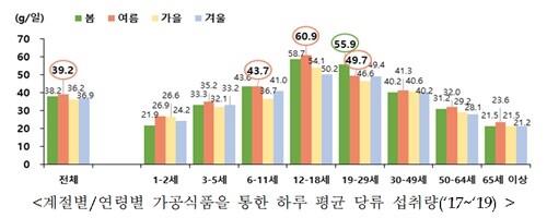 식품의약품안전처 식품의약품안전평가원이 최근 3년간(2017~2019) 우리 국민의 당류 섭취량을 계절별로 분석한 결과, 가공식품을 통한 하루 평균 당류 섭취량은 여름철에 가장 많은 것으로 나타났다고 14일 밝혔다.