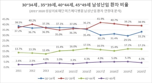 | ▲ 최근10년간 30대,40대 연령별 남성 난임 환자 비율 (사진=미즈메디병원 제공) |