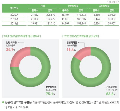 지난해 의약품 생산품목에서 전문의약품이 1만6197개로 처지하는 비중은 75.1%로 집계됐다. 이는 전년 1만5618개 대비 579개 증가한 수치다. 품목생산금액은 17조2174억원으로 전체의 83.6%에 달했다.